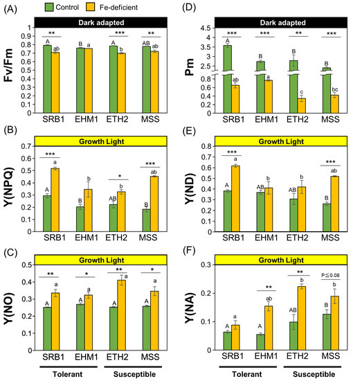 Comparison of the functionality of PSII and PSI in four barley cultivars with varied Fe deficiency tolerance levels: PSII maximum quantum yield, Fv/Fm (A); the quantum yield of light-induced non-photochemical fluorescence quenching induced for photoprotection of PSII, Y(NPQ) (B); the quantum yield of non-light-induced non-photochemical fluorescence quenching related to PSII photoinhibition; Y(NO) (C); the maximal P700 signal, Pm (D); PSI donor-side electron transfer limitation, Y(ND) (E); PSI acceptor-side electron transfer limitation, Y(NA) (F). Data are represented as the means ± SE of three to four independent measurements. * p < 0.05, ** p < 0.01, and *** p < 0.001, indicate significant differences between +Fe and −Fe treatments (according to Student’s t-test). Different letters are shown on individual columns when p is <0.05 among the four barley cultivars based on Tukey multiple testing.