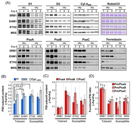 In the case of PSI core subunits, the amounts of PsaA, PsaB, and [4Fe-4S]-containing PsaC in the Fe-deficient SRB1 were unexpectedly and significantly decreased by about 10% compared to their levels in Fe-sufficient control (Figure 2A,C). This residual percentage of PSI core subunits in SRB1 was equal to or less than that of the other Fe deficiency-susceptible cultivars ETH2 and MSS, in which considerably fewer PSI reaction center proteins could be detected. In contrast, EHM1, another Fe deficiency-tolerant variety, retained about 30% of PsaA and as much as 20–25% for PsaB and PsaC under Fe-deficient conditions. As the Western blot analysis in Figure 2A was performed after adjusting the protein concentration to be the same in both Fe-sufficient and Fe-deficient samples, only a tiny amount of PSI protein could be detected in the Fe-deficient samples due to chlorosis. Because of concerns about the quantitation limit of Western blot analysis on protein content basis in Figure 2, we re-performed the same analysis on samples in which the chlorophyll concentration was adjusted to make them equal among all samples to better detect thylakoid membrane proteins in the Fe-deficient samples (Figure S3). As shown in Figure S3A,C (Western blot on a chlorophyll content basis), the reduction in PSII and PSI core subunits was significantly observed in SRB1 and the Fe deficiency-susceptible cultivars ETH2 and MSS. In contrast, the decrease in both PSII and PSI was less pronounced in EHM1, supporting the results shown in Figure 2. These results shown in Figure S3 (Western blot on a chlorophyll content basis) reconfirmed the data shown in Figure 2 (Western blot on a protein content basis); unlike SRB1, it is evident that EHM1 has a strategy to maintain the total amount of photosystem proteins during Fe deficiency.