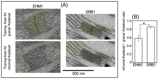 The granal and stromal thylakoid membrane lengths were traced on the vertically visual image of thylakoids using NIH ImageJ (Figure 3 and Figure S4). More than twenty representative SG structures (n = 21 for EHM1 and n = 24 for SRB1) in four TEM images for each cultivar were analyzed (Figure S4). As shown by the yellow line in Figure 3A, the stroma lamella (the non-appressed region) includes the top and bottom planes of the grana stacks and the sheet structure connected with the grana stack (Figure 3A). After calculating the stromal thylakoid to granal thylakoid ratio, we confirmed that the ratio for EHM1 was about 0.6, while that for SRB1 was about 0.8, which in turn showed that the ratio of SRB1 was significantly higher than that of EHM1 by about 45% (Figure 3B).