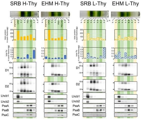 The appearance and protein distribution pattern of the SDG tubes of L-Thy in SRB1 matched those of H-Thy. However, the Fe contents of fr.3 (LHCII-like fraction) and fr.7 (PSI-LHCI-like fraction) in L-Thy of SRB1 were higher than those in the corresponding fractions in H-Thy of SRB1 (Figure 4), suggesting that more Fe seemed to be allocated to the L-Thy in SRB1. In contrast, in EHM1, the distribution of green bands in L-Thy and H-Thy was different in appearance, with fewer fr.7 bands corresponding to PSI-LHCI in L-Thy than in H-Thy. Indeed, the signals of the Western blot against anti-PsaA, B, and C in fr.7 of L-Thy of EHM1 were weak when compared to the corresponding fraction (PSI-LHCI) of H-Thy of EHM1 (Figure 4).