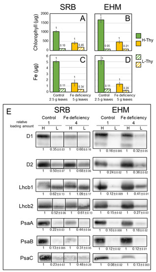 Furthermore, we evaluated the amounts of proteins on the thylakoid membranes. Since Fe deficiency drastically decreases protein complexes on the thylakoid membrane (Figure 2A), we applied four-fold amounts of Fe-deficient samples per lane for Western blot analysis to observe differences between H-Thy and L-Thy. CBB stain images are shown in Figure S8C. The signal intensity of the Western blot was evaluated using ImageJ and we calculated the ratio of L-Thy to H-Thy. We did not normalize the values obtained from Fe-deficient samples based on those from control samples because we had to load eight-fold amounts of Fe-deficient materials to obtain enough signals to compare with those from the control materials, as described above. The Fe-containing proteins, D1 and D2 of the PSII reaction center and PsaA, PsaB, and PsaC of the PSI reaction center, were detected using specific antibodies. Anti-HvLhcb1 and Lhcb2 antibodies were also used, as we previously reported the migration of HvLhcb1 under Fe-deficient conditions [18]. Allocations of all proteins detected in L-Thy were increased by Fe deficiency in both cultivars, but the proportion of each protein on H-Thy and L-Thy was largely different between the two cultivars (Figure 5E). A large proportion of all detected proteins was localized on H-Thy in EHM1 (Figure 5E and Figure S8A). In contrast, SRB1 allocated more D1, D2, Lhcb1, and Lhcb2 belonging to PSII to L-Thy than did EHM1, regardless of the Fe nutritional status (Figure 5E and Figure S8A). However, PsaA, PsaB, and PsaC of PSI were mainly localized on H-Thy of the control SRB1, similar to that of EHM1, but were dramatically decreased by Fe deficiency (Figure 5E and Figure S8A), consistent with Figure 1D. The proportions of these PSI core proteins on L-Thy, however, were further increased by Fe deficiency in SRB1 than in EHM1. Typically, PSII has relatively lower Fe content than PSI. Thus, unbalanced distributions of reaction center proteins composing PSII, PSI, and LHCII proteins on L-Thy obtained from SRB1 (Figure 5E) were consistent with a higher chlorophyll/Fe ratio in L-Thy than in H-Thy extracted from Fe-deficient SRB1 (Figure 5A,C).