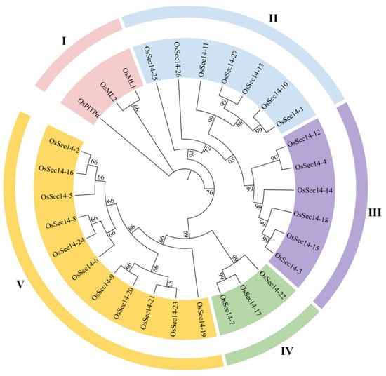 To investigate the evolutionary relationship of rice PITPs family, the phylogeny of OsPitpα, OsSec14, and OsMl proteins were analyzed as shown in Figure 1. The family members were classified into five groups, namely groups I, II, III, IV, and V. The OsPitpα, OsMl1, and OsMl2 formed a separate branch (I). 27 members of OsSec14 subfamily were assigned to groups II, III, IV, and V based on the phylogenetic relationship, and group V had the most members (11), followed by group II (7), while group IV had the fewest members (3), indicating that there were differences in the number and homology of PITPs family proteins during the evolutionary process.