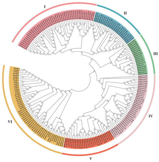 To investigate the phylogenetic relationship between rice PITPs family proteins and other crops such as maize, barley, and A. thaliana, we obtained 1, 1, and 0 OsPitpα homologous proteins, 92, 35, and 32 OsSec14 homologous proteins, and 5, 9, and 9 OsMl homologous proteins from maize, barley, and A. thaliana, correspondingly. By utilizing MEGA7.0 software, we conducted a cluster analysis, and the result was displayed in Figure 2. According to the genetic relationship of the 214 proteins in the phylogenetic tree, they were divided into six groups: I, II, III, IV, V, and VI, and there were variations in the species and quantity of species in different groups. OsPitpα protein and OsMl protein were in the same branch (VI) in the evolutionary tree. Rice OsSec14 protein did not belong to group VI and was different from OsSec14 protein in maize, barley, and A. thaliana. OsPitpα protein was primarily distributed in groups I and II, containing 8 and 7 OsSec14 proteins, respectively. These findings suggest that there are differences in homology between and within species during the evolution of PITPs. These distinctions may be related to the diverse functions of PITPs in plants.