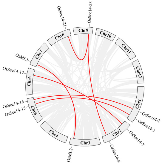 Organisms replicate genes to create new family members, thereby improving gene structure and increasing functional diversity [46]. Gene replication can be broadly classified into three categories: genome-wide replication events, fragment replication events, and tandem repeat [47]. To investigate the expansion pattern of rice PITP genes, intraspecific collinearity analysis was conducted on OsPITPα, OsSEC14 and OsML genes. The analysis revealed that 9 OsSEC14 and 2 OsML genes formed 6 pairs that exhibited collinear relationship, while the others did not. Among these gene pairs, OsSEC14-23 showed the highest collinearity with both OsSEC14-21 and OsSEC14-9 genes, and was in fact the most collinear gene among all members of this gene family. Other gene pairs that exhibited collinear relationship were OsML1 and OsML2, OsSEC14-7 and OsSEC14-17, OsSEC14-2 and OsSEC14-16, and OsSEC14-3 and OsSEC14-1 (Figure 3). Additionally, we found that among the 6 pairs of collinear genes, 2 OsML and 9 OsSEC14 genes underwent segment replication, suggesting that the gene family improved its gene structure and functional diversity through fragment replication.