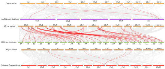 Collinear analysis of the rice PITP rice family across Arabidopsis thraliana, Triticum aestivum, and Solanum lycopersicum.