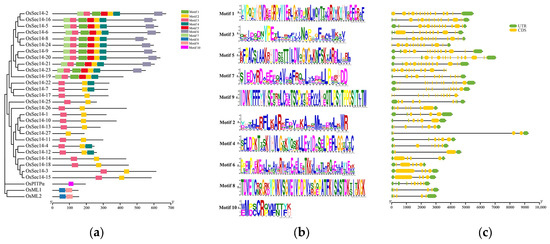Protein conserved motifs and Gene intron/exon structures of the PITPs Family proteins. (a) Conserved motif; (b) Conserved motif sequences; (c) Exon-intron organizations of OsPITPs. Ten conserved motifs labeled with different colors in (a) were found in the OsPITPs sequences using the MEME program. In (c), the green boxes represent 50 or 30 untranslated regions, yellow boxes represent exons, and black lines represent the introns. The lengths of the exons and introns can be determined by the scale at the bottom.