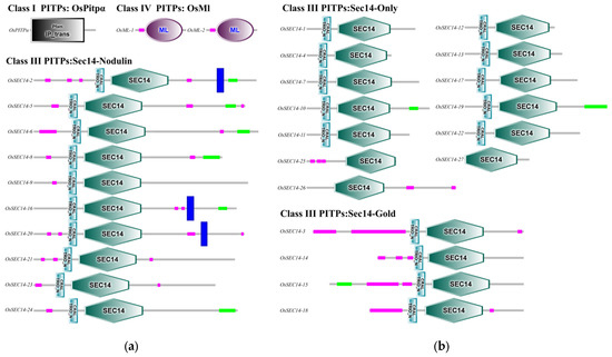 Functional domains of OsPitps. (a) OsPitpα, OsMl and Sec14-Nodulin; (b) Sec14-Only and Sec14-Gold. The SMART website was used to forecast the functional domain. The black and white gradient color box represents IP_trans domain, purple and white gradient color boxes represent ML domain, blue and white gradient color boxes represent CRAL-TRIO domain, green and white gradient color boxes represent SEC14 domain, purple boxes represent low complexity region, blue boxes represent transmembrane region, and green boxes represent coiled coil region.