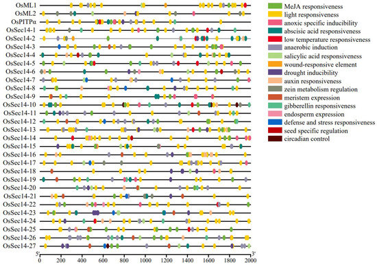Prediction of cis-elements in the promoter region of the rice PITPs gene family. Elements with similar regulatory functions are displayed in the same color.