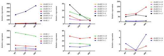 According to the results, as Figure 8 illustrates, the M. oryzae infection led to up-regulation of the expression of 14 genes, concerning OsML-1 and OsSEC14-4 among others. Concurrently, eleven genes, such as OsSEC14-27 and OsSEC14-16 had down-regulated expression levels during the same process, whilst the gene expression levels associated with three genes such as OsSEC-2 remained unchanged. Furthermore, the expression levels of OsSEC14-26 and OsSEC14-14 had down-regulated originally but then became up-regulated during the M. oryzae infection. Consequently, 8 genes with the highest expression levels were selected for qRT-PCR analysis to confirm the changes in gene expression during the M. oryzae infection. The results showed that the expression of OsML-1 increased significantly from 24 h to 48 h after infection, while the expression of OsML-2 decreased during the same time (Figure 9). These results suggest that OsML-1 and OsML-2 might have different functions in plant defense. Additionally, the expression of OsSEC14-3, OsSEC14-4 and OsSEC14-15 were increased significantly during fungal infection. In contrast, OsSEC14-19 was rapidly down-regulated at 12 h and slightly up-regulated between 24 h and 48 h with a considerable difference in expression levels (Figure 9). Hence, we speculate that OsML-1, OsSEC14-3, OsSEC14-4, OsSEC14-15, and OsSEC14-19 may play important roles in rice immunity.