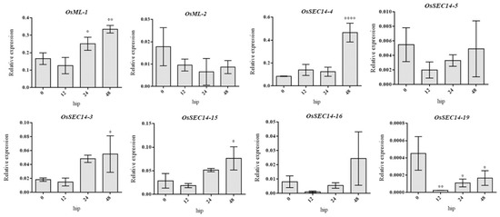 Expression analysis of OsML-1, OsML-2, OsSEC-3, OsSEC-4, OsSEC-5, OsSEC-14, OsSEC-15, OsSEC-16, and OsSEC-19 in wild-type plants infected with rice blast fungus at 0 h, 12 h, 24 h, and 48 h. qRT-PCR data were calculated by the methods of 2−ΔCT. STDEV is indicated as error bars. All data are the mean of 3 biological replicates. Significant differences are shown by * (p < 0.05), ** (p < 0.01) and **** (p < 0.0001).