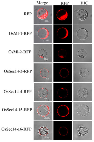 Based on the differences in gene expression levels, we picked out six proteins (OsMl-1, OsMl-2, OsSec14-3, OsSec14-4, OsSec14-15, and OsSec14-16) for transient expression in rice protoplasts. Our findings (as illustrated in Figure 10) revealed that OsMl-1 may be located in the cytoplasm, OsMl-2 located in the cytoplasm and cell membrane. whereas OsSec14-3 was found in the cell membrane and nucleus, which differed from our prediction in Table 2. OsSec14-4 may be located in Golgi and cytoplasm, while OsSec14-15 were located in the cytoplasm, OsSed14-16 were located in the cell membrane. It is speculated that they perform different functions in the organism.