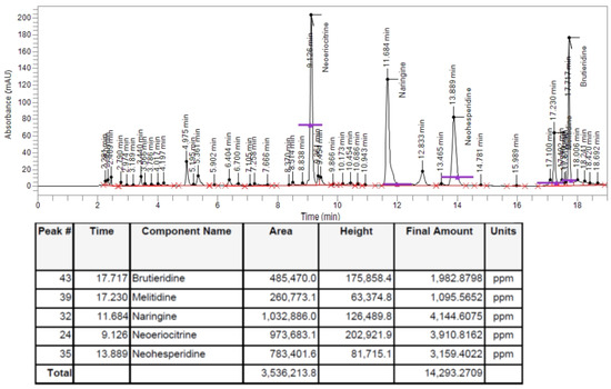 In order to check whether or not the polyphenols contained in BPF, due to which it is possible to justify the antioxidant action of this fruit, were present in the BF fraction, an HPLC analysis was performed following the extraction of BF. As can be observed from the spectrum shown in Figure 1 and from the quantitative report included at the bottom, our objects of interest, flavonoids (brutieridine, melitidine, naringine, neoeriocitrine, neohesperidine) are present.