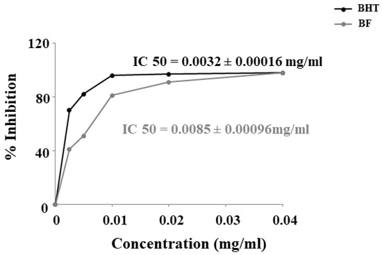 The inhibitory concentration IC50 of BF was calculated after measuring the absorbance. BF has been shown to have a robust antioxidant capacity, lower than the BHT standard, but still high, with an IC50 of 0.0085 + 0.00016 mg/mL. In particular, the IC50 of the BHT standard was 0.0032 + 0.00016 mg/mL (Figure 2).
