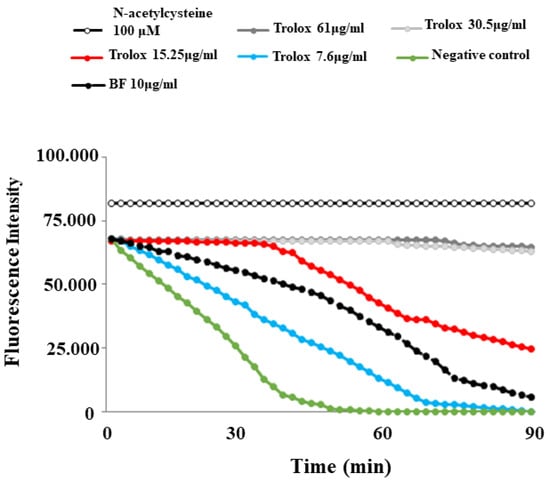 The antioxidant activity of BF was determined by the oxygen radical absorbance capacity (ORAC) assay, which is a method that measures the antioxidant activity of a sample by evaluating the transfer of a hydrogen atom. In particular, the fluorescence loss of fluorescein (used as probe) is measured over time. This fluorescence is due to the formation of peroxylic radicals, following the spontaneous degradation of 2,2′-azobis-2-methyl-propanimidamide, dihydrochloride (AAPH), which occurs at 37 °C. The peroxylic radical oxidizes the fluorescein, causing the gradual loss of the fluorescence signal. Antioxidants suppress this reaction and inhibit the loss of signal. In addition, 6-Hydroxy-2,5,7,8-tetramTethylchroman-2-carboxylic acid (Trolox) is a water-soluble analogue of vitamin E that inhibits the decay of fluorescence in a dose-dependent manner. Fluorescein and AAPH solutions were prepared in PBS (pH = 7.0) at concentrations of 0.02 mg/mL and 59.8 mg/mL, respectively. In contrast, Trolox was made in PBS (pH = 7.0) at concentrations of 7.65, 15.25, 30.5, and 61 μg/mL. Finally, BF was used at a concentration of 10 μg/mL. The evaluation of the fluorescent decay for fluorescein was conducted using a microplate reader, where excitation and emission wavelengths of 485 and 520 nm were used, respectively, at 37 °C. Measurements were carried out in triplicate every 2 min for 1.5 h, and the data obtained from the fluorescence vs. time curves are reported as the average antioxidant efficacy of the antioxidant compound. A regression equation was constructed by comparing the net area under the decay curve of the fluorescein and the Trolox concentration. The area under the curve was calculated with the following equation: