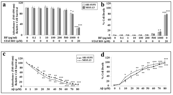 Effects of BF and Aβ on vitality of both cell lines. In panel (a), the representation of cell viability following increasing concentrations of BF on neurons and oligodendrocytes is shown. The experiments were conducted using MTT assay. Under the same experimental conditions, cell mortality is shown in panel (b) (Trypan blue exclusion assay). In these experiments, treatment with STAURO, an apoptosis inductor, was used as a positive control. Panels (c,d) show the toxic effects induced by increasing concentrations of Aβ on neurons and oligodendrocytes on cell viability (MTT assay) and cell mortality (Trypan blue exclusion assay), respectively. Three independent experiments were carried out, and the values are expressed as the mean ± standard deviation (sd). * denotes p < 0.05 vs. the control; ** denotes p < 0.01 vs. the control; *** denotes p < 0.001 vs. the control. Analysis of variance (ANOVA) was followed by a Tukey–Kramer comparison test.