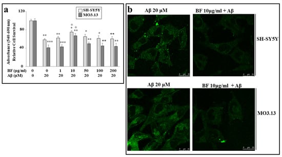 Protection by BF against damage induced by Aβ. In panel (a), only pre-treatment with BF 10 μg/mL is able to protect cells from Aβ-induced damage, and this result can be appreciated by observing the significant increase in viability compared with treatment with Aβ alone. All other BF concentrations tested showed no protective effects on neurons or oligodendrocytes. In panel (b), immunofluorescence images of SH-SY5Y and MO3.13 cells are reported. In particular, the cells were incubated with anti-beta-amyloid antibody. Above, each box indicates the specific treatment related to the image. In the panels (a,b), three independent experiments were carried out, and the values were expressed as mean ± sd. * denotes p < 0.05 vs. the control; ** denotes p < 0.01 vs. the control; *** denotes p < 0.001 vs. the control. ° denotes p < 0.05 vs. Aβ. Variance analysis (ANOVA) was followed by a Tukey–Kramer comparison test.