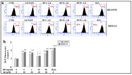 Aβ treatment causes the formation and accumulation of reactive oxygen species, detectable in both cell lines when these treatments are compared to untreated cells. In particular, the increase in ROS is represented by the shift to the right of the cell peak, as indicated by the corresponding percentage. These results are represented in Figure 6a. BF alone (at different concentrations of 1, 10, and 50 μg/mL) does not possess an oxidative effect, and their peaks are similar to those of the the untreated cells (data not shown). The effects of co-treatment (BF + Aβ) show that only the dose of 10 μg/mL causes a significant reduction of ROS, as indicated by the shift to the left of the fluorescence peak. On the contrary, concentrations of 1 μg/mL and 50 μg/mL are ineffective. Despite the similarity of the response, once again oligodendrocytes prove to be more delicate than neurons, maintaining a greater amount of ROS. Finally, H2O2 treatment (100 μM, 30 min) is used as a positive control to demonstrate the functioning of the system. In Figure 6b, the respective quantification is represented.
