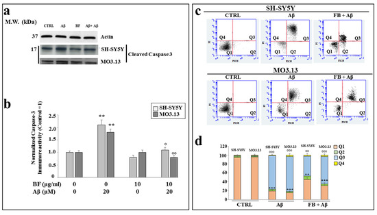 In order to know the type of death generated by Aβ, we studied the expression of caspase-3, which is generally involved in the process of apoptotic death, in our experimental model. As shown in Figure 7a, Aβ treatment was able to increase the expression of cleaved caspase-3 compared to the control; BF alone caused no or little damage, while co-treatment with BF + Aβ generated a significant reduction in the expression of caspase-3, which appeared to be less than the treatment with Aβ but greater than the control. In Figure 7b, the respective quantification of these results is reported. In Figure 7c, an annexin V-PI staining experiment is highlighted, in which we were able to discriminate between types of cell death. As can be seen, the control is represented only by viable cells; Aβ induces the displacement of most cells in the box of late apoptosis, while co-treatment BF + Aβ protected cells, and a large amount remains viable. In these experiments, it was particularly noticeable that BF resulted in more protection in neurons than in oligodendrocytes, as can be inferred from the comparison of co-treated cells that remain viable: in fact, neurons are numerically more than oligodendrocytes. In Figure 7d, the respective quantification is reported.