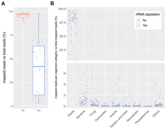 (A): Boxplot of the percentage of reads mapped against the SILVA LSU rRNA database compared to the total number of reads in the dataset for samples with (“Yes”) and without (“No”) an rRNA depletion step. (B): Percentage of reads mapped against the SILVA LSU rRNA database per organism category relative to the total number of mapped reads. Each dot represents one dataset, and colors indicate if rRNA depletion was applied during library preparation. Some outliers are not visible on the graph.