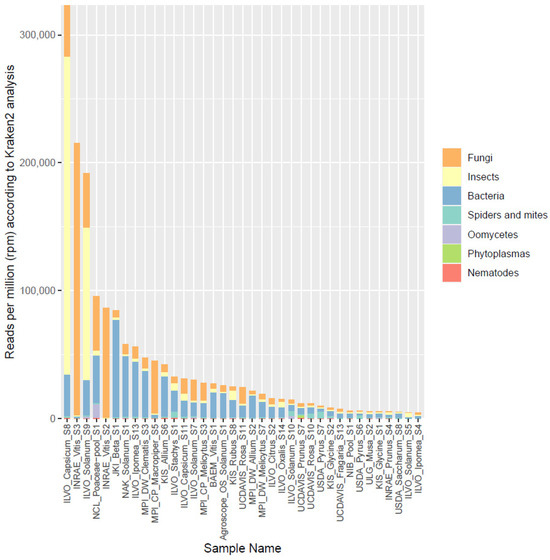 Overview of the proportion of reads (in reads per million) assigned by Kraken2 to different broad organismal categories (fungi, insects, bacteria, spiders and mites, oomycetes, phytoplasmas, and nematodes) for the 37 selected datasets.