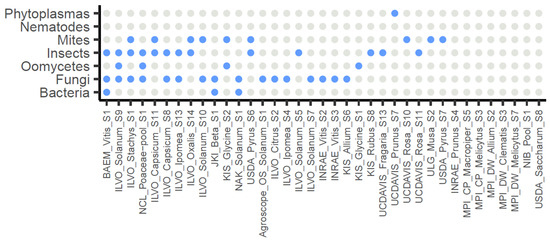 Overview of the 37 selected datasets and the potential presence of non-viral pathogens and pests as grouped by broad organismal categories. Grey: no observed presence (<100 rpm), blue: observed presence (≥100 rpm).