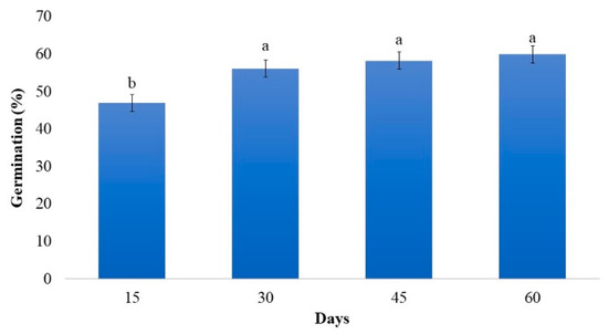 No interaction was observed between cultivation time, scarification, and the use of GA3 in seed germination. The highest germination rate, 53.57%, occurred after 30 days. After this period, a small but not significant increase was observed. Between 15 and 30 days, there was a difference of 8.49%, and after 45 and 60 days, there was an increase of 10.25% and 12.35%, respectively (Figure 1), demonstrating that germination up to 30 days should be considered, as there is no significant increase with time. Compared to the field germination time, 7 to 8 weeks [24], germination appears to be very favorable.