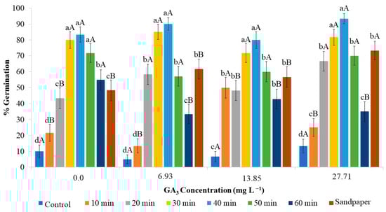 In vitro germination percentage of strelitzia seed in 30 days as a function of chemical and physical scarification of seeds and different concentrations of GA3. The data are expressed as mean ± standard error (bars). Means followed by the same lowercase letter do not differ from each other for seed scarification time, and means followed by the same uppercase letter do not differ from each other for GA3 concentration according to Scott–Knott test (p < 0.05).