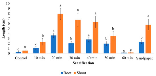 Average shoot length (orange) and length of the longest root (blue) at 60 days of in vitro cultivation as a function of chemical and physical scarification of strelitzia seeds. Data are expressed as mean ± standard error (bars). Means followed by the same letter do not differ significantly according to the Scott–Knott test (p < 0.05).