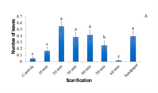 Analyzing the development of seedlings after 60 days of cultivation, the shoot length, root length, and number of leaves were also affected by scarification (Figure 3). Chemical scarification for 20, 30, and 40 min in sulfuric acid, as well as physical scarification, promoted the greatest shoot lengths. The shortest scarification times, 0 (control) and 10 min, as well as the longest scarification times, 50 and 60 min, resulted in lower values for shoot and root length. This can be explained by the lower germination of seeds observed in these treatments.