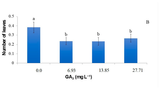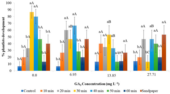 The physical scarification of strelitzia seeds using sandpaper resulted in a germination percentage of 73.33% when supplemented with 27.71 mg L−1 of GA3 in the culture medium, which was higher compared to physical scarification used alone. However, seeds that were scarified with sandpaper and inoculated in the culture medium supplemented with lower concentrations of GA3 (6.93 and 13.85 mg L−1) or without the addition of GA3 showed a lower germination percentage (Figure 2). Therefore, to increase germination in strelitzia using physical scarification, the addition of GA3 at a concentration of 27.71 mg L−1 is essential.