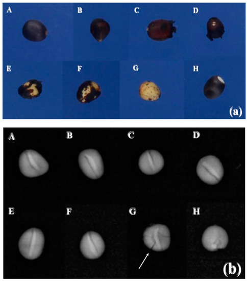Images of strelitzia seeds obtained by (a) GroundEye® and (b) X-ray device. (A) Untreated seeds. (B) Seeds scarified with sulfuric acid for 10 min. (C) Seeds scarified with sulfuric acid for 20 min. (D) Seeds scarified with sulfuric acid for 30 min. (E) Seeds scarified with sulfuric acid for 40 min. (F) Seeds scarified with sulfuric acid for 50 min. (G) Seeds scarified with sulfuric acid for 60 min. (H) Seeds scarified with sandpaper. Arrow points to the crack in the seed endosperm.