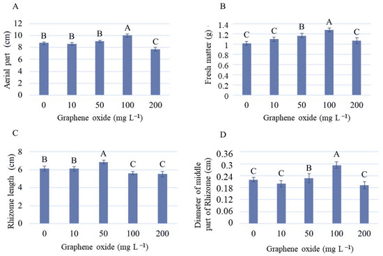 The tested concentrations of graphene oxide (GO) influenced the aerial part, plant weight, rhizome length, and diameter. For the aerial part, it promoted greater growth compared to the other concentrations, which were similar to the control or lower, such as the use of 200 mg L−1, indicating an inhibitory effect (Figure 8A). Similarly, the plant weight was higher at a concentration of 100 mg L−1, as a result of the increased growth (Figure 8B).