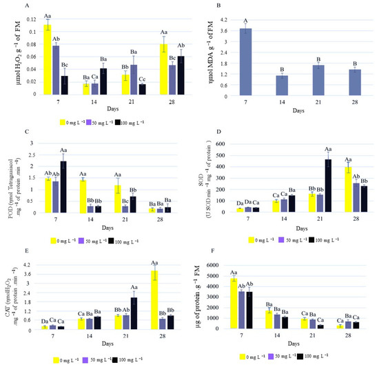 Hydrogen peroxide (A), lipid peroxidation (B), POD activity (C), SOD activity (D), CAT activity (E), and protein quantification (F) in in vitro cultivation of strelitzia in the presence of GO. Capital letters that are the same do not differ statistically in relation to the days. Lowercase letters that are the same do not differ in relation to the concentrations of GO.