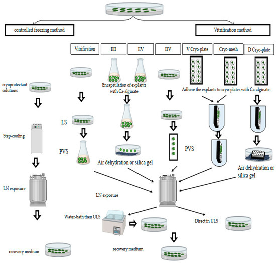 Cryopreservation techniques and the major steps in different procedures. ED: encapsulation–dehydration; EV: encapsulation–vitrification; DV: droplet vitrification; LS: loading solution; PVS: plant vitrification solution; LN: liquid nitrogen; ULS: unloading solution.