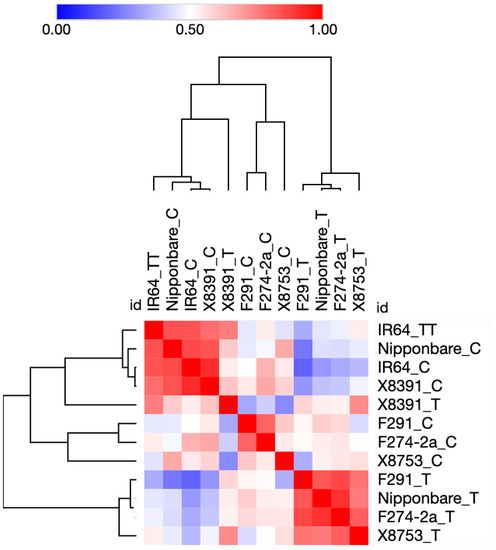 First, we updated the functional annotations of all 2026 DEGs identified by Hsu and Tung, 2017 [12] based on the current information available at the Rice Annotation Project database (RAP) (https://rapdb.dna.affrc.go.jp) [38], and Gramene (https://www.gramene.org) [39] (both databases accessed on 10 December 2022). Next, we extracted transcriptome data for 183 genes encoding for TFs. The expression profile of 183 TF genes suggested a clear difference between the submergence-susceptible IR64 rice genotype and the other five submergence-tolerant genotypes Nipponbare, F291, F274-2a, X8391, and X8753. As shown in Figure 1, the average gene expression profile of IR64 does not change significantly when subjected to submergence. IR64 samples subjected to submergence stress resemble Nipponbare controls (not subjected to submergence stress). In contrast, Nipponbare, F291, F274-2a, X8391, and X8753 show significant change in their overall gene expression under submergence compared with their respective controls. In addition, Nipponbare, F291, F274-2a, and X8753 share the majority of upregulated and downregulated genes in response to submergence. Notably, the expression profile of X8391 genes significantly differs from those of Nipponbare, F291, and F274-2a. Overall, X8391 is more similar to X8753 (see Figure 1).