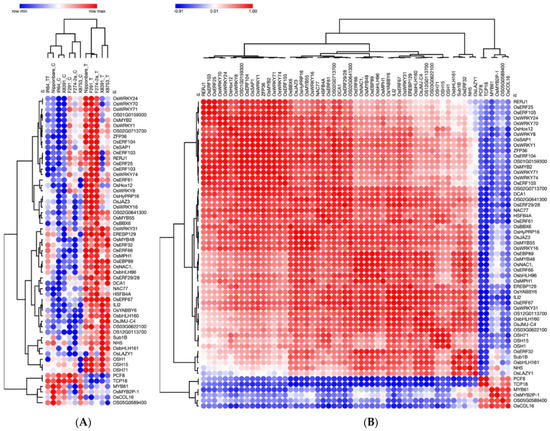To gain a more profound understanding of the co-expression profiles of 57 TFs, we visualized their expression profiles. As shown in Figure 2A, no significant difference in gene expression was observed in the susceptible genotype IR64 control (not subjected to submergence stress) and submergence-treated IR64 samples. In fact, IR64 submergence-treated samples resemble the Nipponbare control samples. However, 38/57 genes are upregulated in all submergence-tolerant rice genotypes, including Nipponbare, F291, F274-2a, X8391, and X8753 (see Figure 2A). Overall, the gene expression profile of Nipponbare, F291, and F2742a are more similar: these genotypes share 50 upregulated and four downregulated genes. The expression profiles of rice genotypes X8753 and X8391 are highly similar as they share 42 upregulated genes (see Figure 2A). Although most genes in this group show upregulation in response to submergence in tolerant genotypes, six genes, including OS05G0589400, PCF8, TCP18, MYB61, OsMYB2P-1, and OsCOL16, are downregulated in all tolerant genotypes (see Figure 2A). The hierarchical clustering of 57 genes, based on their expression across all samples, suggests a strong positive correlation between the upregulated genes and a strong negative correlation between the upregulated and downregulated genes (see Figure 2B).