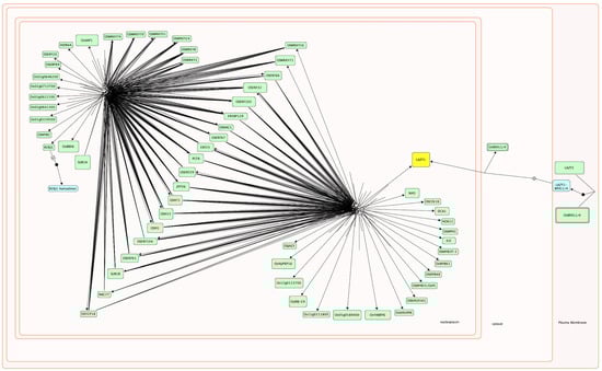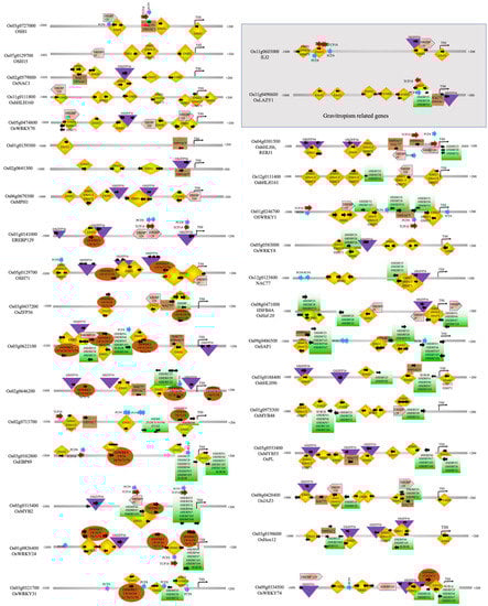 Gene co-expression information is often used to construct gene networks to understand the transcriptional regulation at a genome-wide level and to link genes that may have common regulators and/or play a role in closely related processes [41,42,43]. We carefully note here that the evidence from the co-expression of genes in the same tissues and organs and in response to a given stress condition only suggests possible connections among these genes. Thus, to establish the direct or indirect ‘Transcription Factor–Target’ relationship within this group of 57 TFs, we investigated transcription factor binding sites present in the promoter region of each of these genes (see Supplementary Table S1). In addition, published empirical evidence on the promoter–TF bindings, gene–protein/protein–protein interactions, and mutants were gathered to support gene–gene connections and their associations to pathways associated with rice plant development as well as a stress response (see Table 1 for summaries of all TFs). Overall, we found that 26/57 TFs have one or more binding sites in the promoter region of many genes. The remaining 31 TFs have no binding site present in the promoter region of any genes included in this group (see Supplementary Table S1).