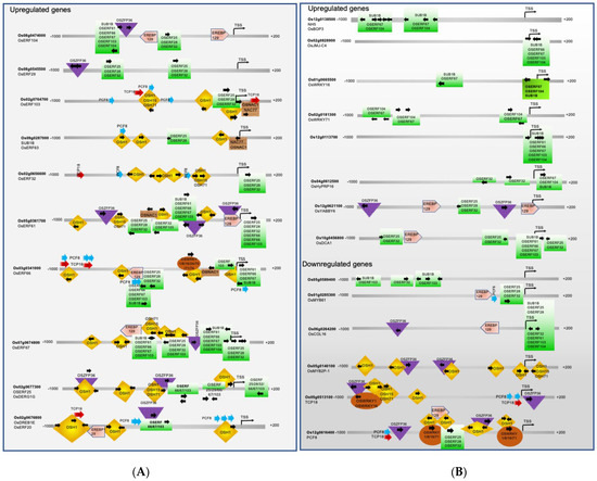 Promoter analysis of ERF-regulated genes that show differential expression during rice seed germination and coleoptile elongation. (A) Promoter analysis of ERFs coding genes. (B) Promoter analysis of ERFs-regulated genes that show upregulation, and promoter analysis of downregulated genes including four ERF-targets and two genes that are not direct targets of ERFs. The downregulated genes are shaded with a darker grey color.