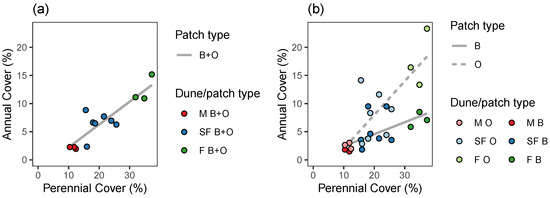 Annual plant cover as a function of perennial plant cover, for each dune (a) and for each dune and patch type (b). Lines illustrate linear regression fit.