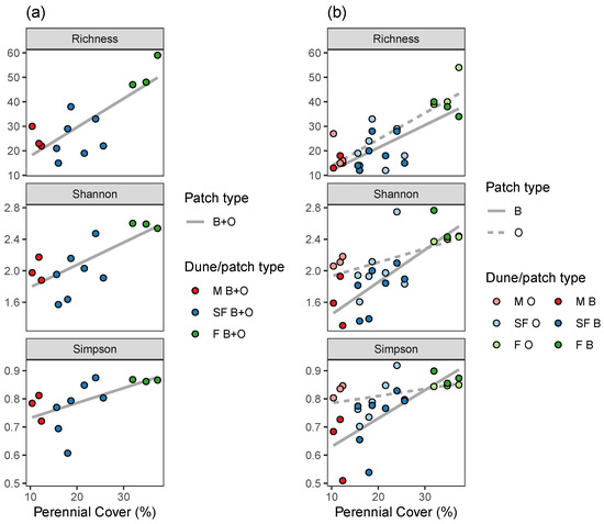 Species diversity metrics (richness, Shannon index, and Simpson index) as a function of perennial cover, for each dune (a) and for each dune and patch type (b). The lines illustrate the linear regression fit.