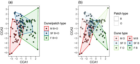 Site scores on axes 1 and 2, using Canonical Correspondence Analysis (CCA) constrained by dune type and patch type for all sites combined. Dune types (a) or dune type and patch type combinations (b) are marked using convex hull polygons.