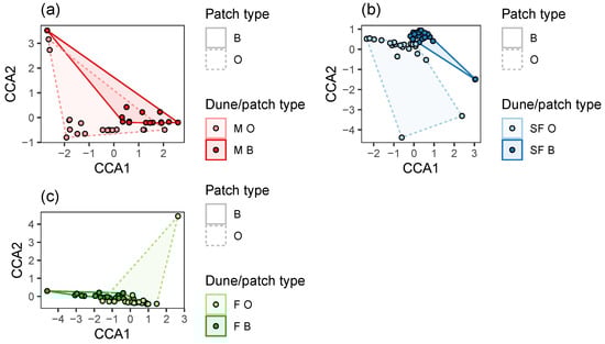 Site scores on axes 1 and 2, using Canonical Correspondence Analysis (CCA) constrained by patch type, separately for Mobile (M) (a), Semi-Fixed (SF) (b), and Fixed (F) (c) dunes. Patch types are marked using convex hull polygons.