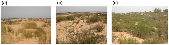 Dune types: (a) Mobile (M), (b) Semi-Fixed (SF), (c) Fixed (F). Photographs by Prof. Pua Bar, 2018.