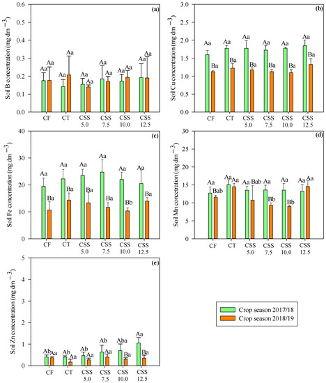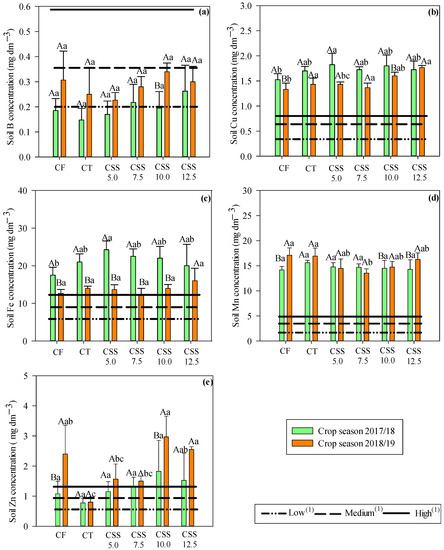 In the case of a depth of 0.20–0.40 m, only concentrations of Mn and Zn varied between the applied treatments, while concentrations of Cu, Fe, Mn, and Zn varied in the function of agricultural years (Figure 2). Residual rates of CSS above 7.5, 10.0, and 12.5 Mg ha−1 resulted in higher concentrations of B, Cu, Fe, and Zn. In addition, the highest available soil Mn concentration was verified in CT and with CF. The same results were observed at two depths (0.0–0.20 and 0.20–0.40 m). However, the highest Mn concentration was observed in the CTs in the 0.20–0.40 m layer. Still, at a depth of 0.20–0.40 m, it was found that the levels of B and Zn in the soil were similar in both agricultural years. However, it was possible to notice greater availability of Cu, Fe, and Mn at a soil depth of 0.20–0.40 m for the 2017/18 agricultural year.