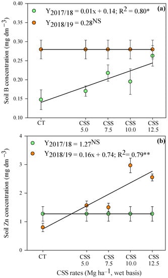 Availability of B (a) and Zn (b) in the soil at the 0 to 0.2 m depth layer after common bean cultivation in response to residual applications of composted sewage sludge (CSS) rates. **, * and NS—Significant at 1 and 5% and not significant, respectively. Error bars indicate the standard deviation of the mean (n = 4). Legend as in Figure 1.