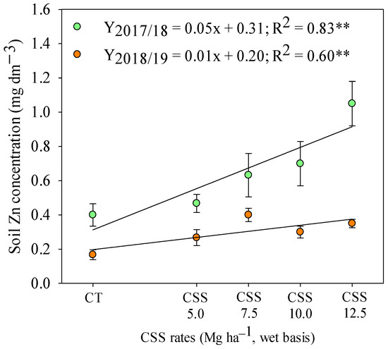 Soil Zn availability at the 0.2–0.4 m depth layer after common bean cultivation in response to residual application of composted sewage sludge (CSS) rates. **—Significant at 1%. Legend as in Figure 1.