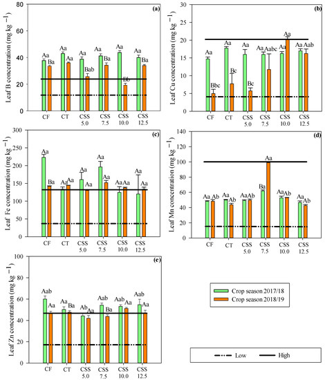 Micronutrient concentrations—B (a), Cu, (b), Fe (c), Mn (d), and Zn (e)—in common bean leaves in response to the effect of treatments (legend as in Figure 1) and of the evaluated agricultural years. Significant differences (p ≤ 0.05; Tukey test) between treatments (lowercase letters) or agricultural year (uppercase letters) are indicated by different letters. Error bars indicate the standard deviation of the mean (n = 4). The horizontal lines on graph bars represent range of interpretation of micronutrient concentrations for common bean crop as described by Ambrosano et al. [28].