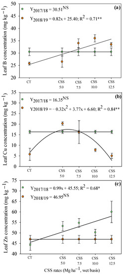 Evaluating the residual effect of CSS rates on the leaf micronutrient concentrations, a linear increase in Zn concentrations was observed with the application of CSS rates in the first agricultural year (2017/18) (Figure 6a). In addition, leaf B and Cu concentrations were not influenced by the residual effect of CSS rates in the first year (Figure 6b,c). In the second agricultural year (2018/19), the residual effect of CSS rates linearly increased the leaf B concentration (Figure 6a). Leaf Cu concentration was set to a quadratic adjustment, being observed that the rate of 5.9 t ha−1 of CSS (wet basis) provided the highest Cu concentration (17.70 mg kg−1) in common bean leaves (Figure 6b).