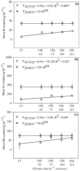 Extraction of B (a), Fe (b), and Mn (c) by common bean crop in response to residual application of sewage sludge compost (CSS) rates. **, * and NS—significant at 1 and 5% and not significant, respectively. Error bars indicate the standard deviation of the mean (n = 4). Legend as in Figure 1.