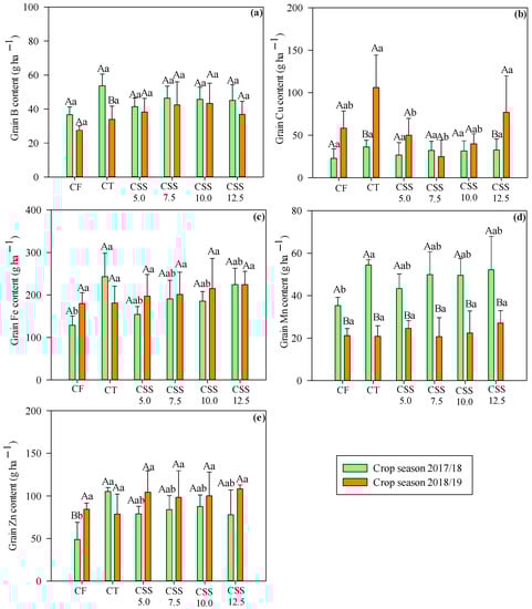 Micronutrient extraction for winter beans was significantly influenced by the treatments (Figure 7). The treatments with CF showed the highest B extractions in both agricultural years. The concentration of B extraction ranged from 26.64 g ha−1 in the 2017/18 agricultural year to 50.02 g ha−1 of B in the 2018/19 agricultural year (Figure 7a). It was noted that CSS applications increased the shoot B content in common bean plants as compared to the control treatment in both agricultural years, with average B contents ranging from 14.17 to 44.28 g ha−1. Hence, the average concentration of extracted B by plants was increased by 5.25 g ha−1 in the first year and 20.89 g ha−1 in the second year, which probably came from the correction of acidity through limestone application in the initial phase of the experiment, contributing to higher physiological efficiency of the plant in the extraction from one year to the next.
